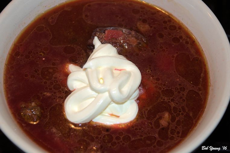 Oh my. The finished product! And as the recipe says, “Ladle the soup into bowls and garnish with the scallions, dill and a dollop of crème fraîche [or sour cream]. Serve with spicy mustard and slices of dark bread.” The diced scallions and dill or fennel will really add to the flavors.
