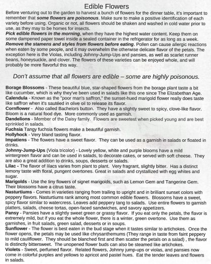 The time really has come. We are supposed to stay “self quarantined” and restrict our travels and public “contact”. Robin and I try to practice this and, I think, we are succeeding. With that in mind, think about creating a “Victory Garden”. We have no grass to mow in the front yard – it is mostly herbs and flowers. More herbs than flowers. And I have some pots going in flowers, Pansies right now, but there will be more and a pot of micro greens. You really can grow squash or zucchini or tomatoes or cucumbers or beans and the list goes on and on. Use your imagination. And then grow it. It will help to keep you home and away from the store and the crowds. Here is some information on growing edible flowers and some suggestions. You can print these out for your use. Left Click the graphic and then CTRL+P to print. (Zucchini and squash flowers can be picked and stuffed.)