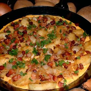 In the Netherlands, a boerenomelet (“farmer’s omelette”), photo on right, is a popular dish, usually consisting of 2 to 3 eggs, a mixture of sautéed onions, mushrooms, potatoes, bell peppers, leeks, garden peas, salt and pepper (for seasoning). The dish has many variations. Pictured here is but one variation.