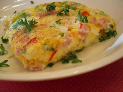 A frittata is a kind of open-faced Italian omelette that can contain cheese, vegetables, or even leftover pasta. Frittate are cooked slowly. Except for the cooking oil, all ingredients are fully mixed with the eggs before cooking starts.
