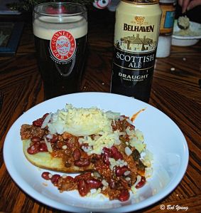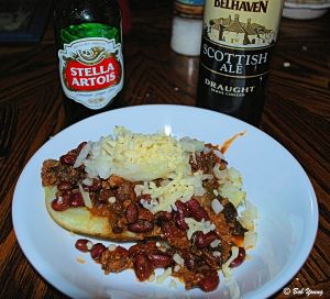 Today was the Famous Idaho Potato Bowl here in Boise at the BSU Stadium. So, we needed to have something for our small Tailgate Party. Maybe potatoes? Yes, but with what? How about with my Mom’s Chili Con Carne Modified over a good, baked potato. (The photo to the left is the dish in the crockpot!) Wow! It was great! and it did bring back some memories of her making the chili. I just had to modify it because Robin can not eat sweet green peppers. So I modified Mom’s recipe and used Poblanos that I fire roasted on the grill. And most of this was locally grown: the beef, potatoes, onions and peppers. The tomatoes were not. Here are some photos with the Chili over a fresh Baked Potato. Enjoy!