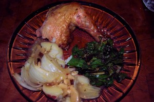 Ah yes, another good chicken dinner. I wen to the store today and they had roasting chicken on sale – $0.69 per pound. I got two right around 5 3/4 pounds and froze one. Here is what we did with the other one. Actually a really good baked chicken. I added the onions to the potatoes and mushrooms.