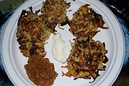 Earlier in the day we made Latkes, but not as good as we had the other day. We adjusted the recipe and added fresh apple to the latkes before cooking. Different. Also, we didn’t have any apple sauce, but we did have Pear Apple Butter.
