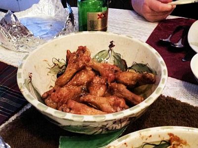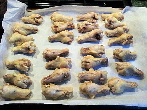 Chicken wings (drumlets) getting ready for the oven. They’ve already been steamed.