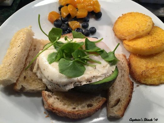 (Remove the seed from 1/2 an avocado and place a poached or soft cooked egg in the hole. Top with micro greens.)