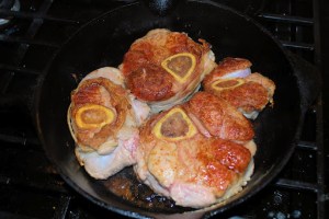 In a large Dutch Oven pot, heat vegetable oil until smoking. Add tied veal shanks to the hot pan and brown all sides, about 3 minutes per side. Remove browned shanks and reserve.
