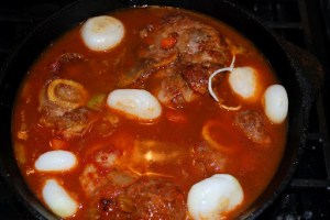 In the same pot, add the onion, carrot and celery. Season with salt at this point to help draw out the moisture from the vegetables. Saute until soft and translucent, about 8 minutes. Add the tomato paste and mix well. Return browned shanks to the pan and add the white wine and reduce liquid by half, about 5 minutes. Add the bouquet garni and 2 cups of the chicken stock and bring to a boil. Add the cipolline onions. Reduce heat to low, cover pan and simmer for about 1½ hours or until the meat is falling off the bone. Check every 15 minutes, turning shanks and adding more chicken stock as necessary. The level of cooking liquid should always be about ¾ the way up the shank.