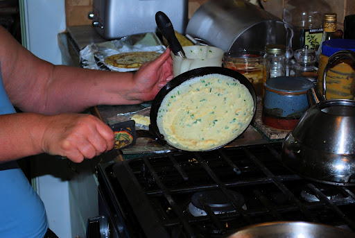 Robin is cooking one side of the Crêpe. Roll the pan to cover the bottom with the batter, about one-third of a cup.