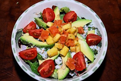 So look at what we had tonight. A Crab Salad! Three different types of lettuce, Orange and Pineapple Salsa, Avocado Slices, Tomato and fresh squeezed Lime Juice. And this was really a good and refreshing salad. The Orange and Pineapple Salsa – we made it from scratch – was great. I can dream of it with Grilled Pork Steaks. And yes, I did eat my half of the avocado, not one of my more favorite vegetables.