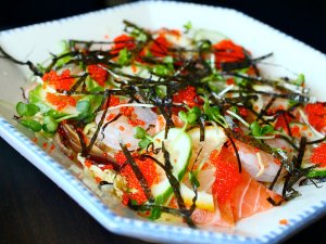 Chirashizushi is a type of Sushi which has lotus roots, shrimp and thinly shredded egg omelet on the top of vinegar rice. It has been a dish enjoyed widely at celebrations.