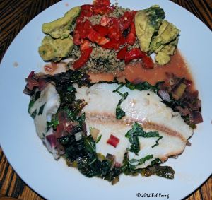 The oven roasted vegetables really made this dinner. And the garlic accentuated the mild sole – it did not over power it. The bed of fresh raw spinach added to the plate.