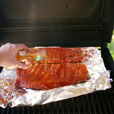 Once the ribs have been on the grill for 30 minutes it is time to move to the second stage. Now we are going to make the ribs tender by steaming them with apple juice. The secret is to wrap the ribs tightly in foil. You want to get it as water tight as possible (after you have poured in the apple juice).