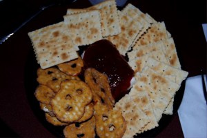 When we arrive, the tables had this delicious Table Treat of Mascarpone and Chive with Lemon Juice Dipping Sauce. Debbie served it with Pita Chips and Crackers. It hit the spot.