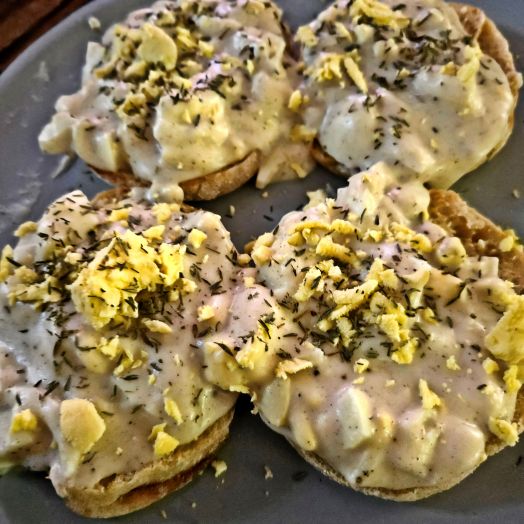 Note: When you add the eggs to the white sauce, you can also add chopped spinach or corn or anything you like. Great on toasted sourdough toast or toasted English Muffins.